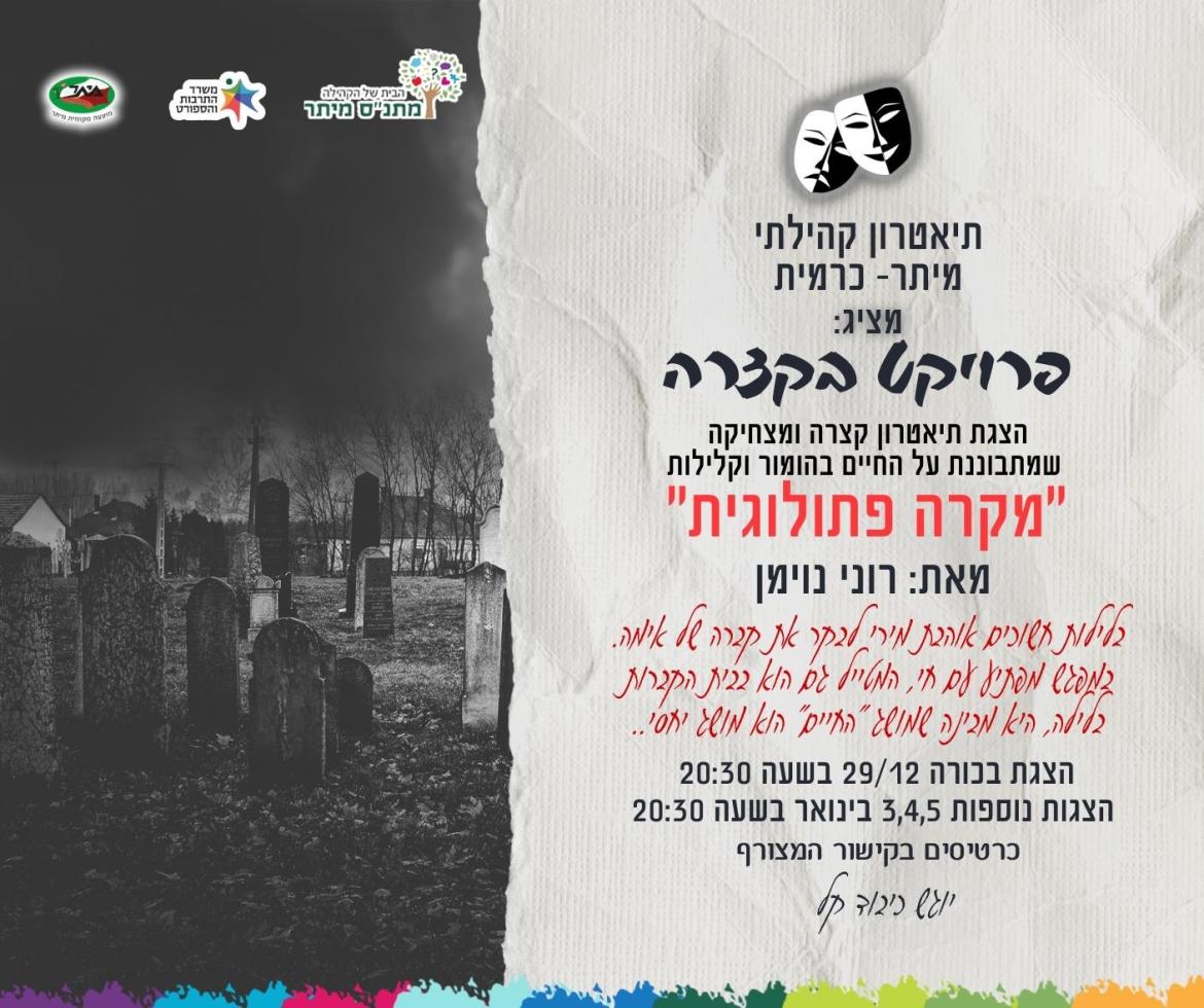 הצגת הבכורה של "מקרה פתולוגית" מאת רוני נוימן תתקיים ביום חמישי, 29/12, בשעה 20:30 במתנ"ס מיתר והצגות נוספות יתקיימו גם ב-3,4,5 בינואר באותו מקום ובאותה שעה.