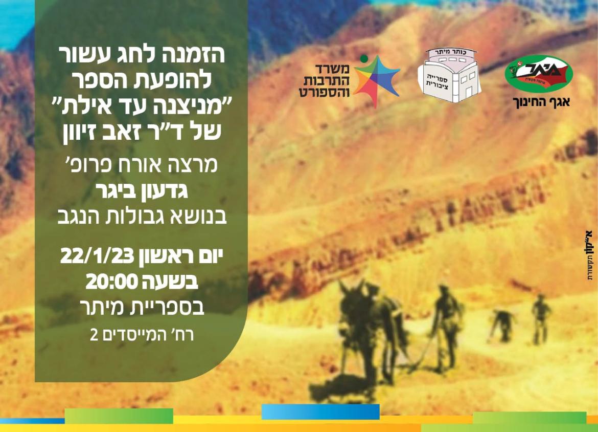 לרגל עשור להופעת הספר "מניצנה עד אילת" של ד"ר זאב זיוון, ספריית מיתר מזמינה אתכם למפגש עם המחבר ולהרצאת אורח של פרופ' גדעון