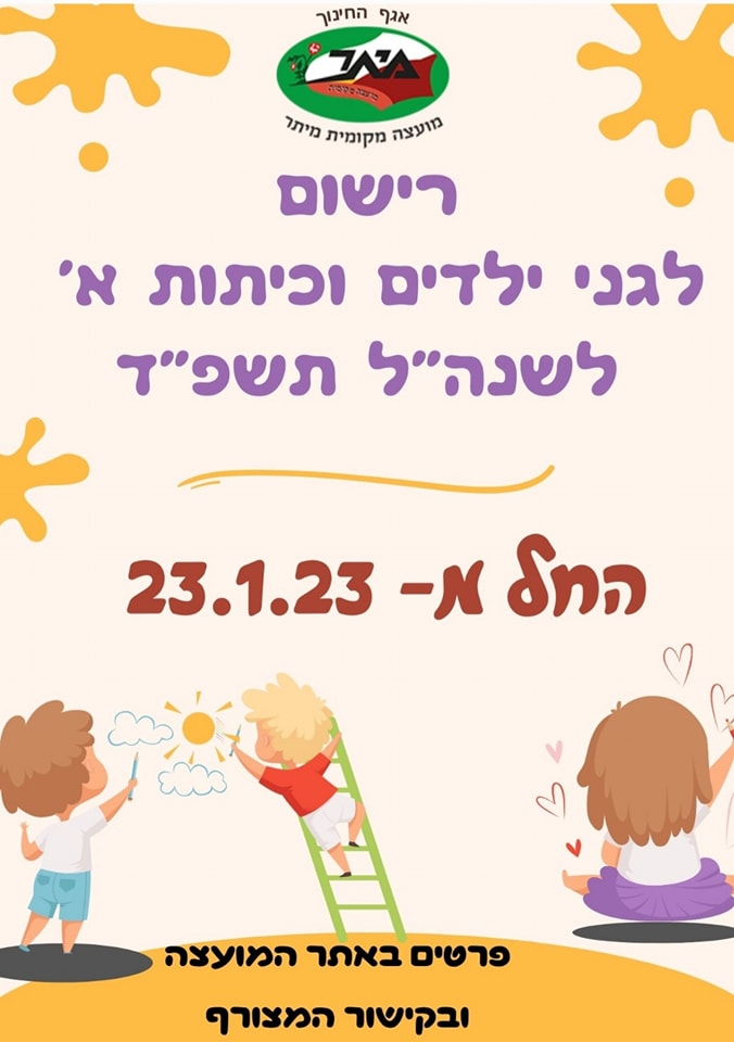 אגף החינוך מודיע כי תקופת ההרשמה לגני הילדים ולכיתות א' בשנת הלימודים תשפ"ד תיפתח ביום שני 23/1/23 ותסתיים ביום שני 20/2/23.