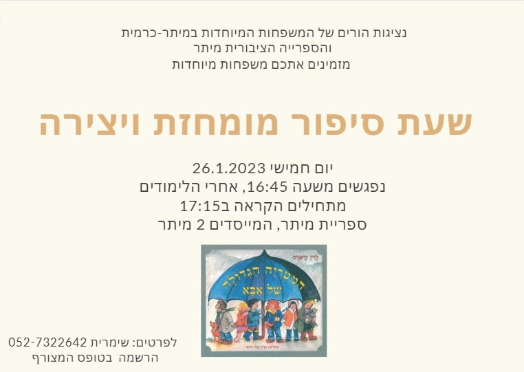 משפחות מיוחדות מוזמנות לשעת סיפור מומחזת ופעילות יצירה בעקבות הסיפור