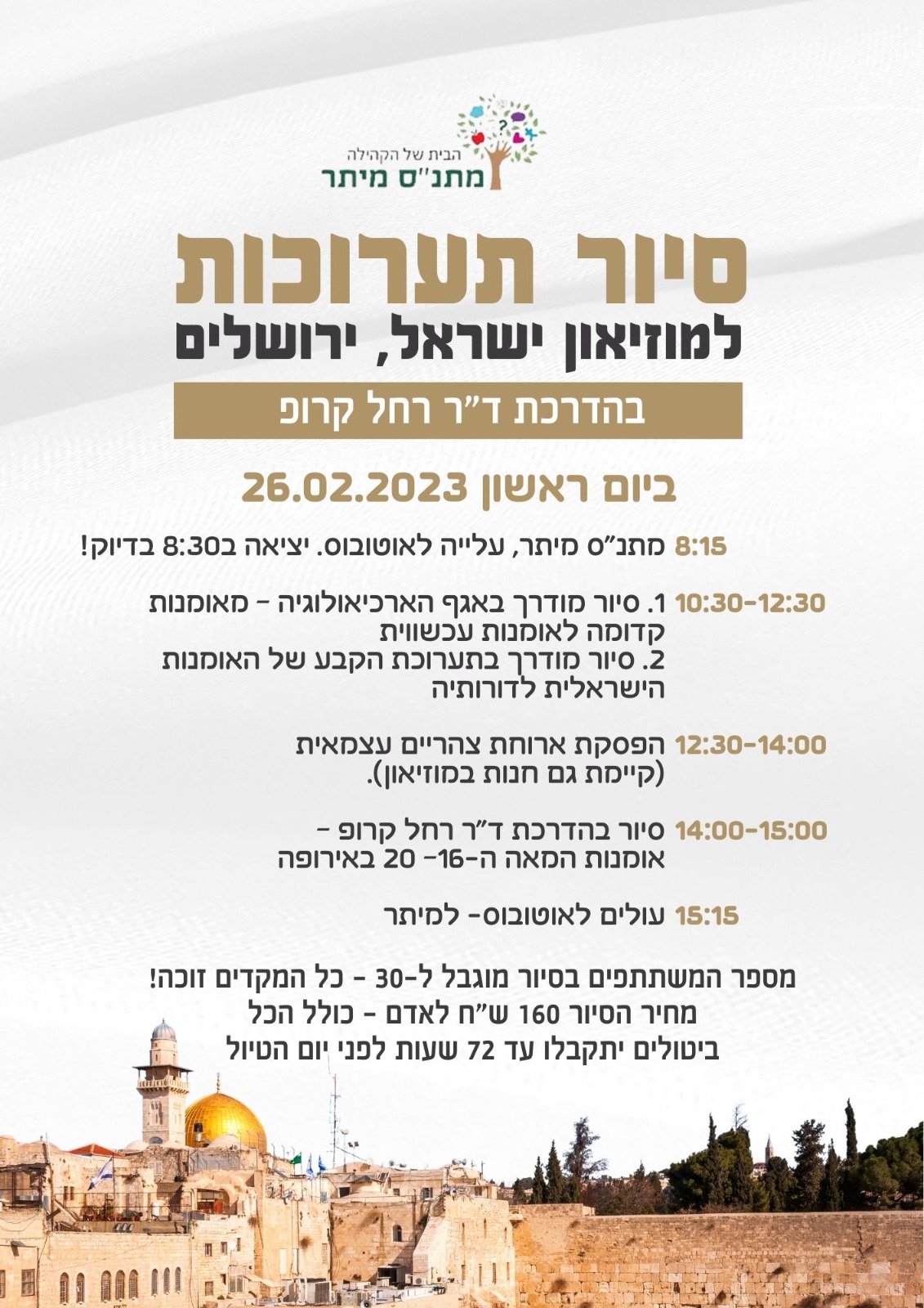 מתנ"ס מיתר מזמין אתכם לצאת לסיור תערוכות במוזיאון ישראל בירושלים בהדרכת ד"ר רחל קרופ.