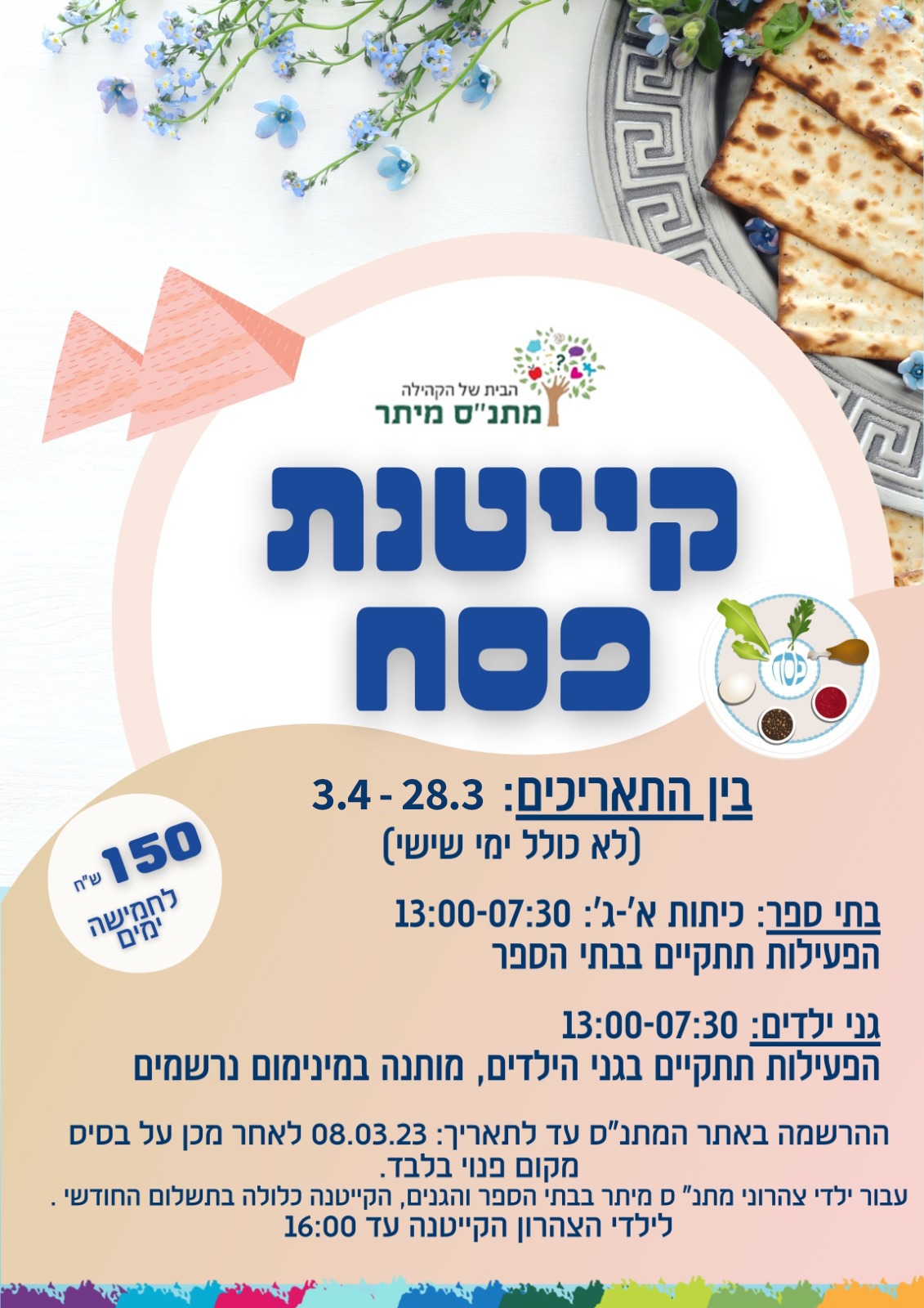 הקייטנה תתקיים בין התאריכים 3/4-28/3 (לא כולל שישי) והיא מיועדת לילדי א-ג (בבתי הספר) ולילדי הגן (בגנים, בכפוף למינימום נרשמים).